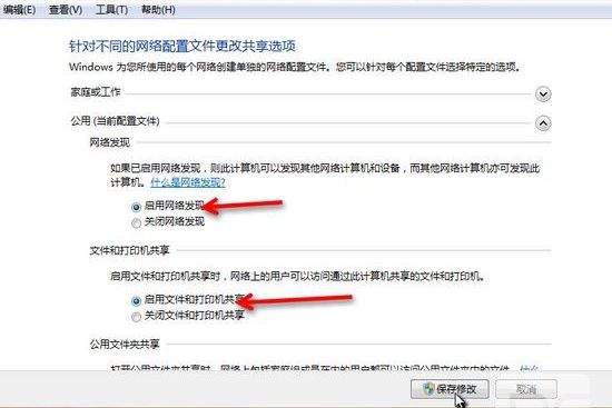 選擇 公共網(wǎng)絡---選擇以下選項:啟動網(wǎng)絡發(fā)現(xiàn)------啟動文件和打印機共享-----啟用共享以便可以訪問網(wǎng)絡的用戶可以讀取和寫入公用文件夾中的文件(可以不選)----關(guān)閉密碼保護共享( 注釋:其他選項默認即可!)