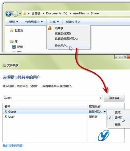 上述設置完畢,即可在Windows 7下開啟某個文件夾的共享功能,使得Mac電腦可以讀取甚至寫入文件的目的。打開需要共享的文件夾——在窗口上方的“共享”下拉菜單中點擊“特定用戶…”——在彈出的選項窗總添加“Guest”,并將權限級別進行相應設置。